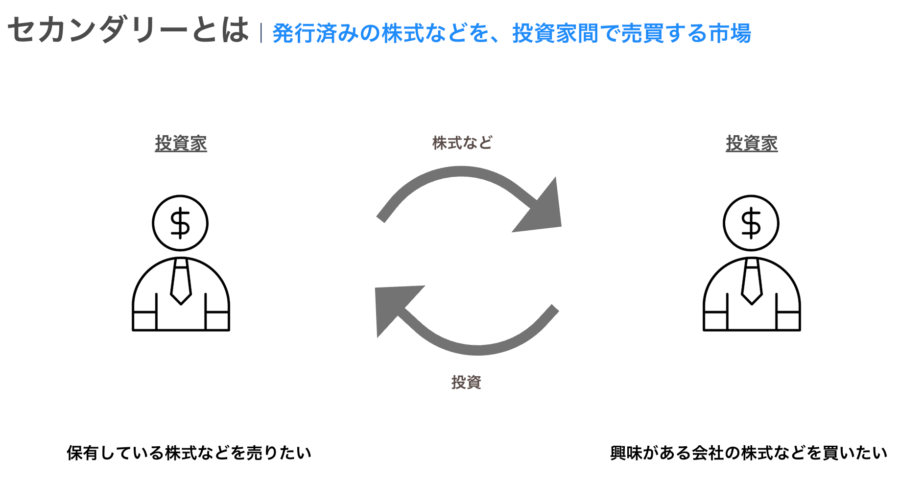 一方で、セカンダリーは何かと言うと、投資家の間で売買される取引のことでしたね。一番大きな違いは、「スタートアップが」「新規に発行する株式などを」取引するのではなく、「投資家同士で」「過去に発行した株式などを取引する」市場になります。