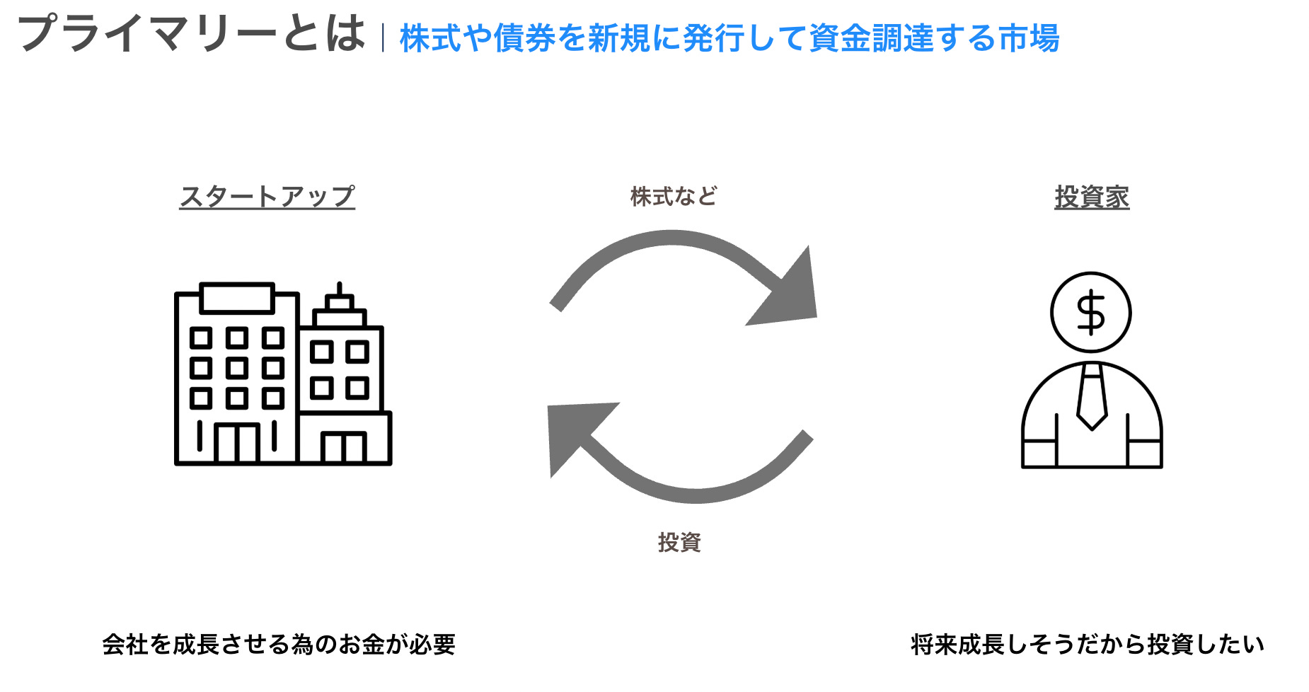 ちょっと難しいですが、プライマリーとセカンダリーをそれぞれ分けて分けてお話しようと思います。まずはプライマリーから。先ほどお話した通り、プライマリーは「企業が」「新しく発行する株式や債権を取引する」市場になります。